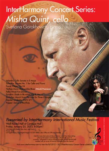 Cellist MISHA QUINT made his orchestral debut at the age of 13 after winning first place in the Boccherini Competition in St. Petersburg. Some of the celebrated orchestras that Quint has performed with include: Orquestra Sinfônica do Teatro Nacional do Brasilia, The Metropolitan Symphony, New York Chamber Orchestra, The National Irish Symphony, Brooklyn Philharmonic, London Soloists Chamber Orchestra at Queen Elizabeth Hall, The Moscow State Symphony Orchestra, The Leningrad Philharmonic Orchestra, Leningrad State Orchestra, Orchestra of Classical and Contemporary Music and the Symphony Orchestras of Latvia and Georgia. Quint has worked with an equally illustrious group of conductors, including Maxim Shostakovich, Paul Lustig Dunkel, Colman Pearce, Sidney Harth, Ravil Martinov, Camilla Kolchinsky, Yaacov Bergman, Franz Anton Krager and Ira Levin, and premiered works the most outstanding composers of today including Sophie Goubadalina, Robert Sirota, Steven Gerber, Thomas Fortmann, Nathan Davis, and Alfred Schnitke. Quint is an active chamber musician and has performed with such artists as Nikolai Znaider, Bela Davidovich, Sherban Lupu, Andrzej Grabiec, Yuri Gandelsman, Boris Kushnir, and Mikhail Kopelman. Quint started founding music festivals in Europe in 1997 with the creation of The International Cello Festival in Blonay, Switzerland, followed by the Soesterberg International Music Festival in Holland in 1998. Quint established the InterHarmony Music Festival in Geneva, Switzerland in 2000, and has since moved iterations of the festival to San Francisco, the Berkshires in Massachusettes, Schwarzwald, Germany, Sulzbach-Rosenberg, Germany, and Tuscany, Italy. Quint is currently on the faculty of the Preparatory Division at Mannes College The New School for Music, in Manhattan.www.mishaquintcello.com